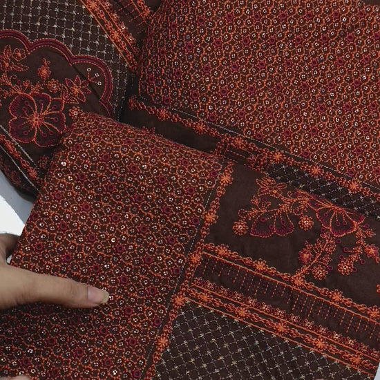 3pc Dhanak Heavy embroidery zarqaskh rust brown